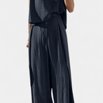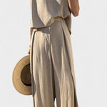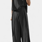 - Silhueta e ajuste: Blusa minimalista sem mangas e calças de cintura alta e perna larga que acentuam a cintura e proporcionam liberdade de movimento.