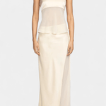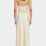 - Design e construção: Vestido midi assimétrico, sobretecido de cetim e um top sem ombros proporcionam movimento, estrutura e elegância moderna.