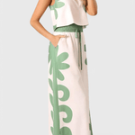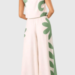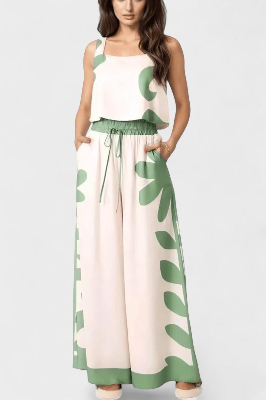 - Silhueta e movimento: Blusa sem mangas e calças largas criam uma silhueta leve e drapeada, que acompanha os seus movimentos.