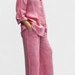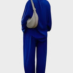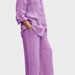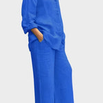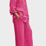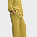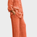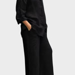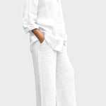 - Silhueta e ajuste – Top solto e pernas de calças retas oferecem liberdade de movimento e uma silhueta sofisticada e intemporal.