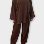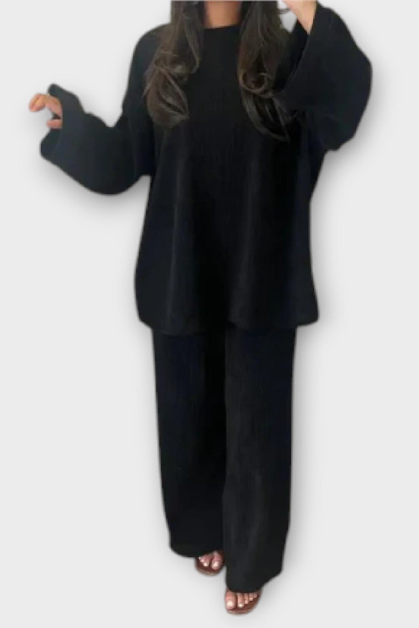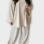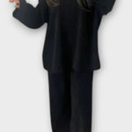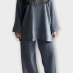 - Corte oversized: Blusa de manga longa e calças retas criam liberdade de movimento e uma silhueta harmoniosa.